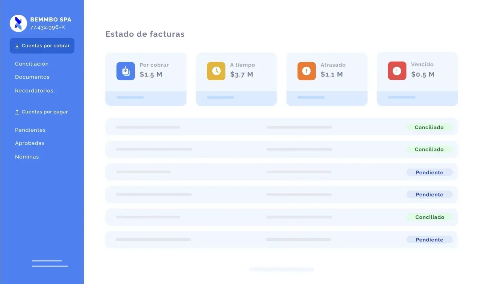 Los clientes de Bemmbo visualizaban en su plataforma todas las cuentas por pagar. Hasta ese paso, la startup había automatizado el proceso con una interfaz amigable y un proceso tecnológico.